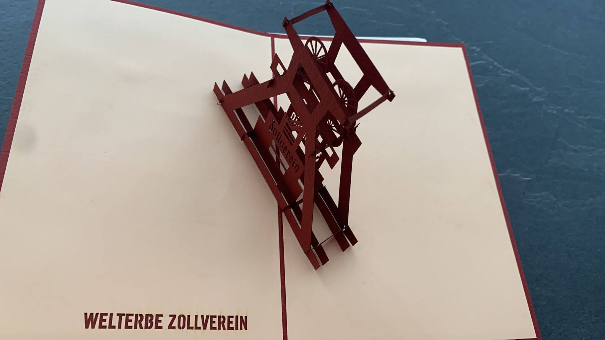 Klappkarte mit Förderturm und innen einen Scherenschnitt