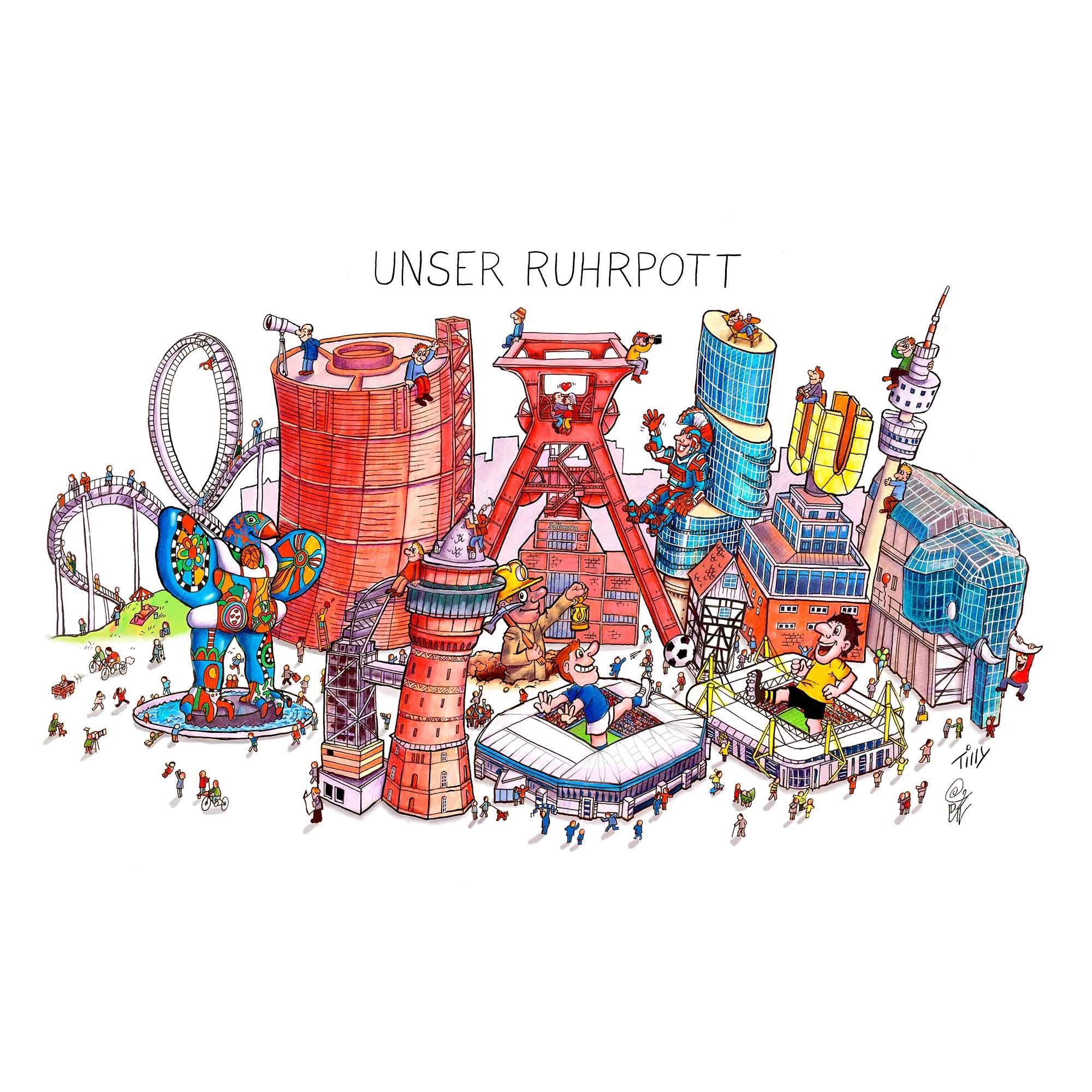 Bunte Motive und Wahrzeichen des Ruhrgebiets, schön in Szene gesetzt von Jacques Tilly.